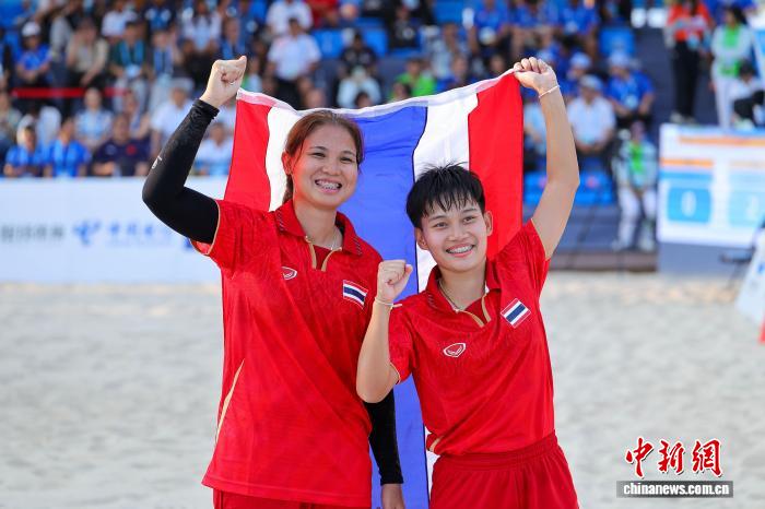 图为得到冠军的泰邦撮合阿丽亚·洪迪/墨塔蒂普·昆塔通(左)脚举邦旗庆贺。中新社记者 骆云飞 摄